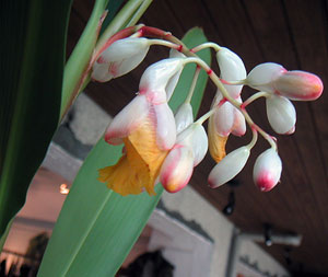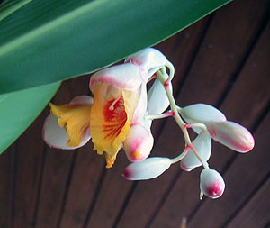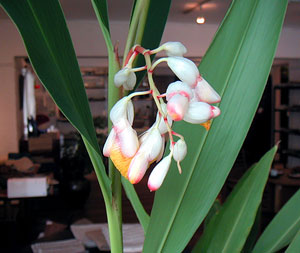 沖縄に自生する月桃、神戸では無理かなと 思っていましたが・・・。 種から育てて2年、丹精の結果ですね。 白いつぼみから、こぼれ出た花弁は 何と黄色、気品が漂います!